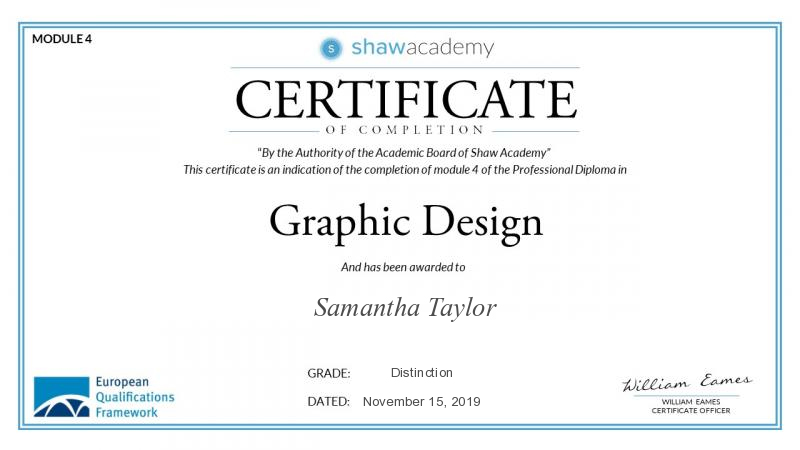 I am delighted to announce I have finished my EQF level 5 Diploma in Graphic Design. This was a course split over 4 modules and 16 weeks. I'm so pleased after a lot of hours of seminars and coursework, I have now completed all of my end of module assessments and passed with DISTINCTION! All my module certificates are below: